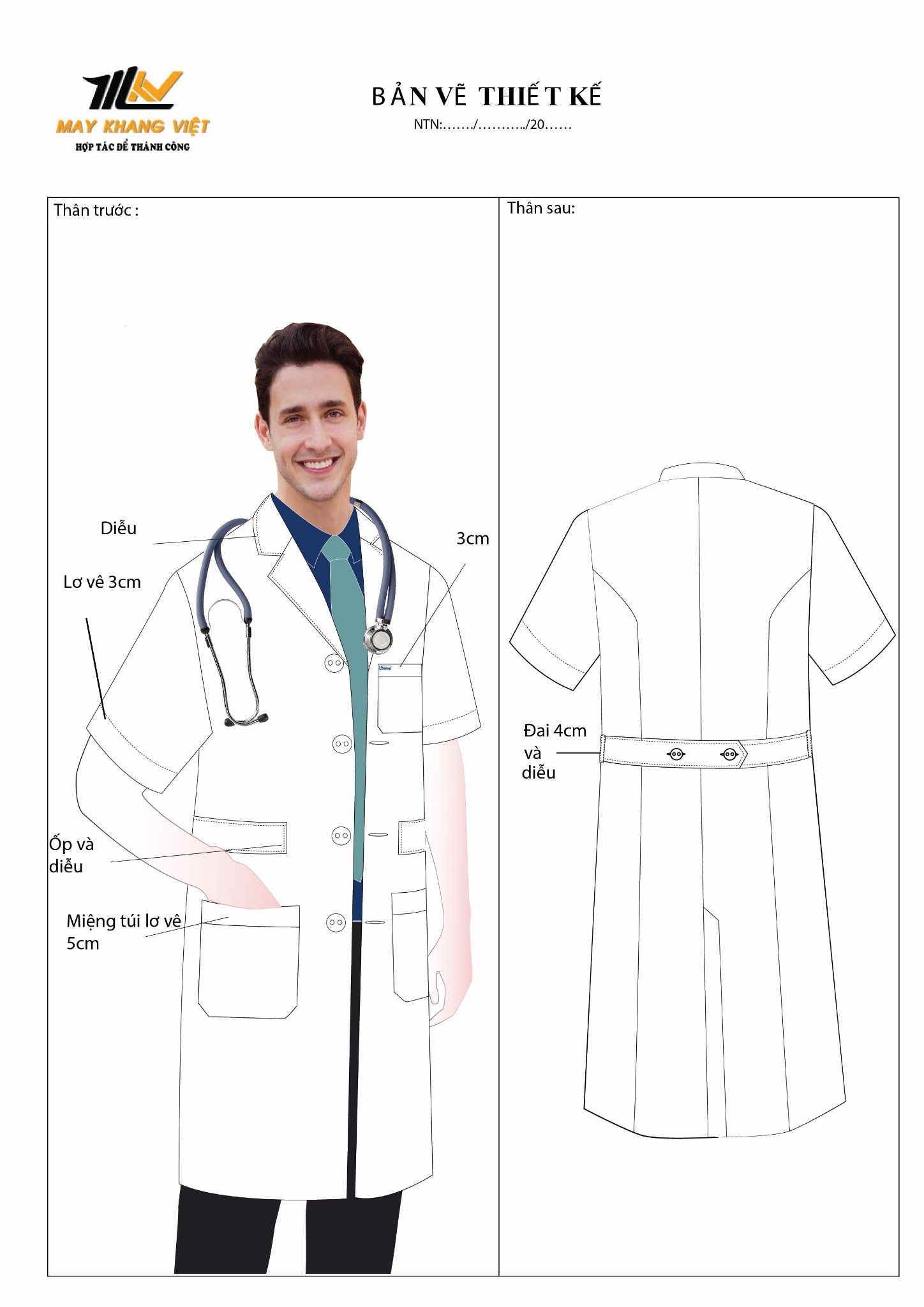 Kiểu dáng: Áo blouse cổ 2 VE, cài KHUY giữa BẰNG KHUY NHỰA, chiều dài áo NGANG gối, kiểu ngắn tay, phía trước có 3 túi, có khuy cài biển công tác, CÓ ĐAI EO BẢN 4CM XẾP CHỒNG PHÍA SAU VÀ CÀI 2 KHUY, phía sau xẻ giữa tới ngang mông.