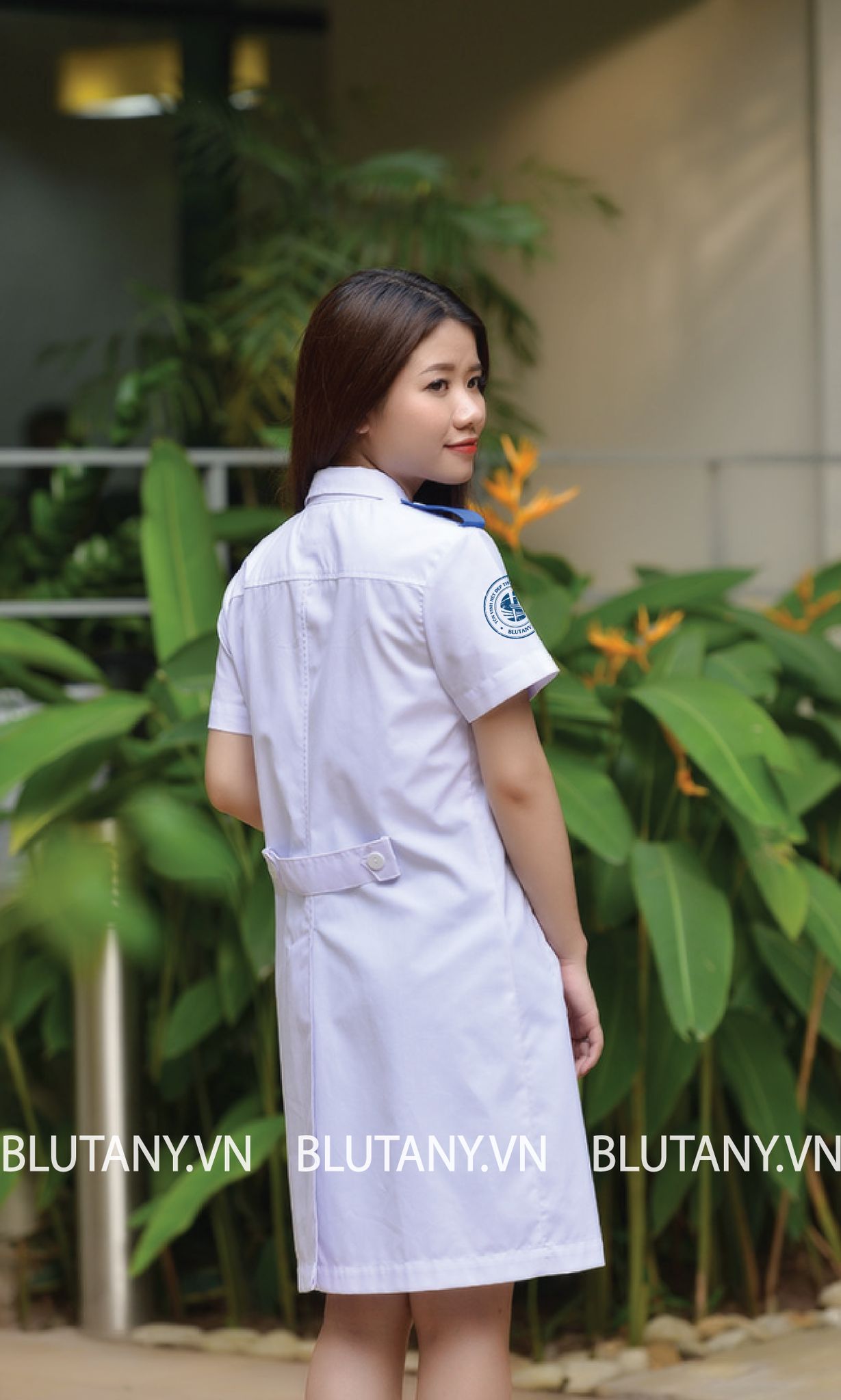 KIỂU DÁNG: ÁO BLOUSE CỔ 2 VE, CÀI KHUY GIỮA BẰNG KHUY NHỰA, CHIỀU DÀI ÁO NGANG GỐI, KIỂU NGẮN TAY, PHÍA TRƯỚC CÓ 3 TÚI, CÓ KHUY CÀI BIỂN CÔNG TÁC, PHÍA SAU XẺ GIỮA TỚI NGANG MÔNG VÀ CÓ CÁ VAI MÀU XANH.